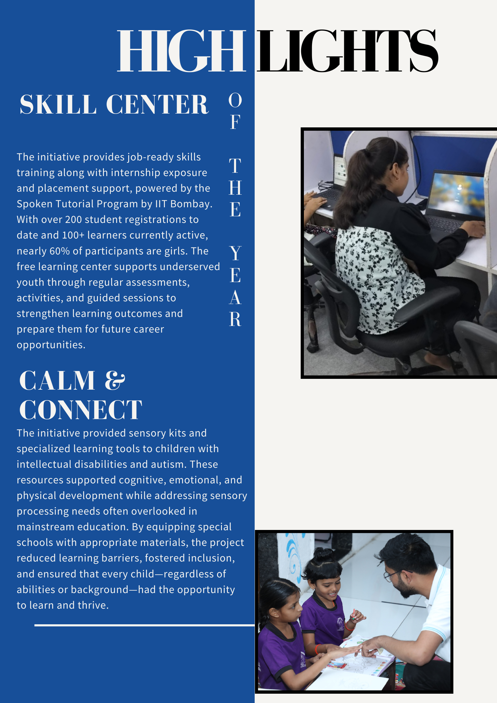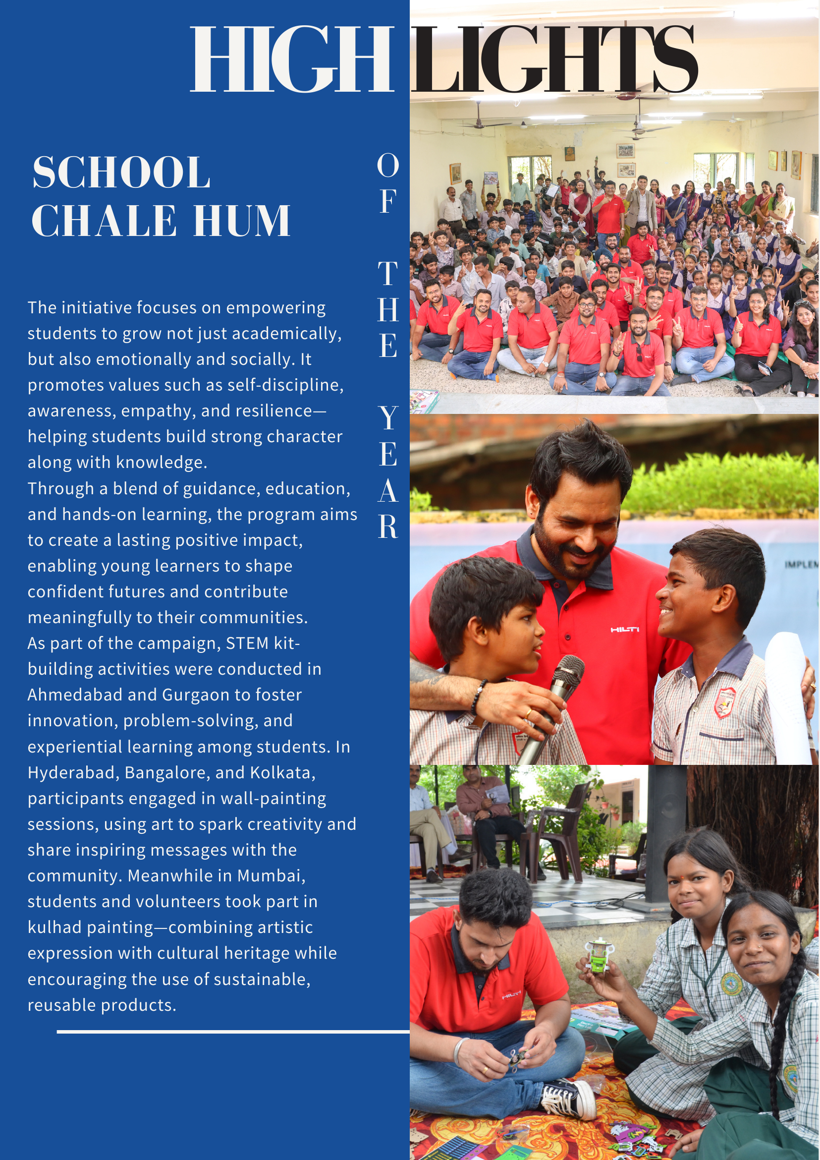 - Education and skills: support to government schools, digital learning programs, education programs for youth and women, and livelihoods programs.